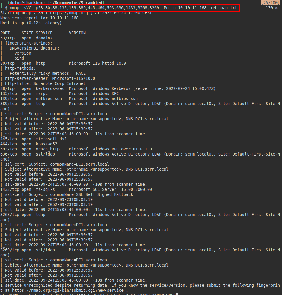 We run nmap tool on ports 53, 80, 88, 135, 139, 389, 445, 464, 593, 636, 1433, 3268, 3269, with script and software versions: